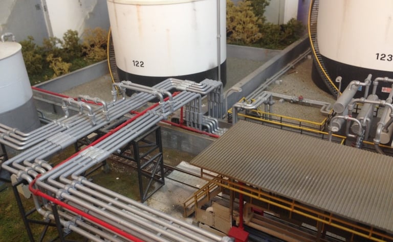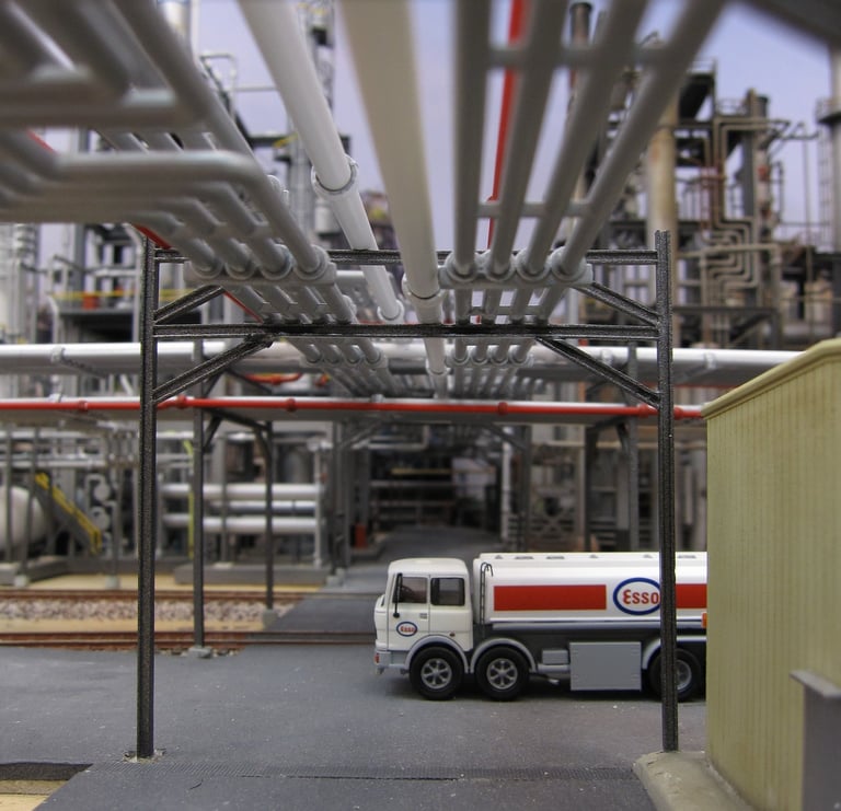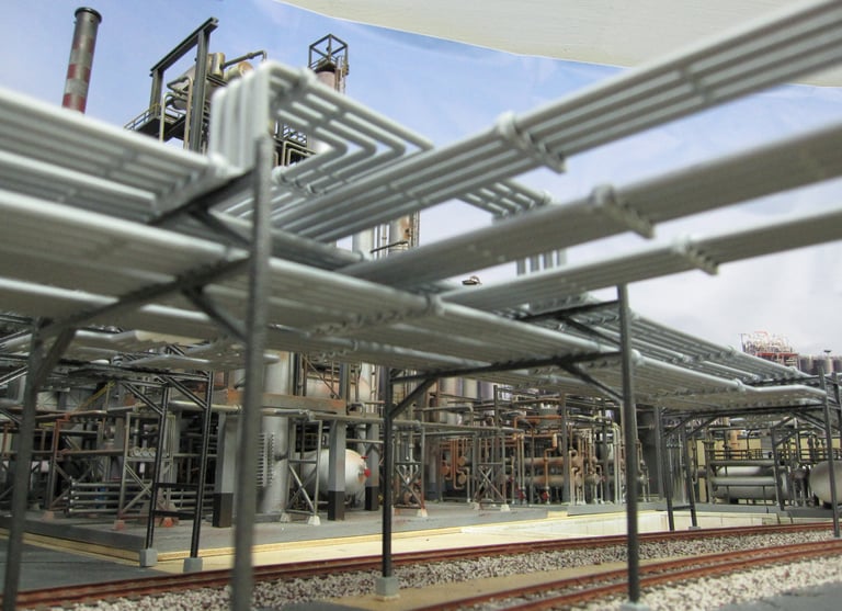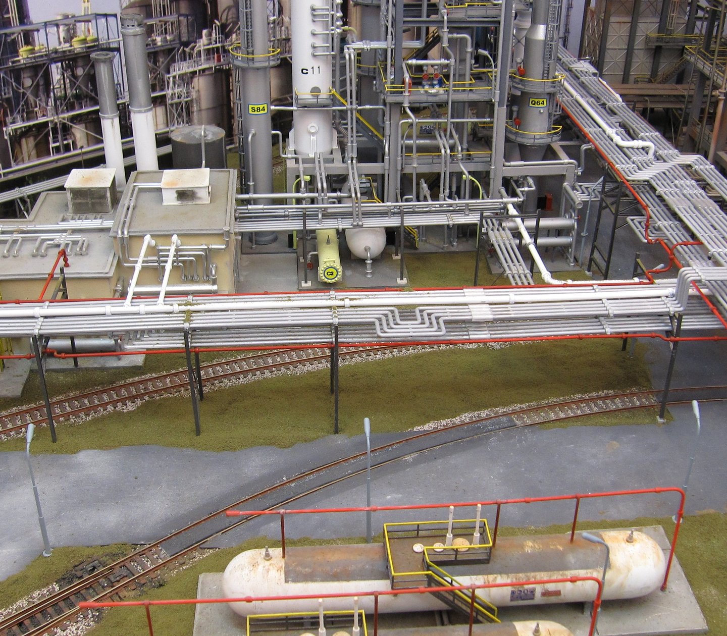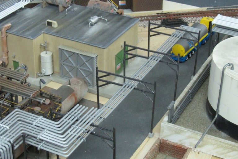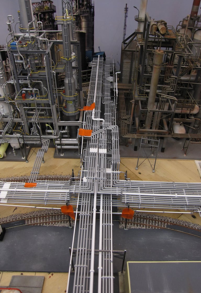 Per riprodurre una così grande quantità di tubazioni anche nella raffineria GM Oil in scala HO, iniziai già durante la fase di progettazione del plastico: dovevo unire in modo plausibile tre impianti di pirolisi, più di quaranta serbatoi, le pensiline di carico e di scarico per il trasferimento del petrolio e dei prodotti raffinati, nonché aggiungere l’intera rete antincendio e pure i tubi del gas diretti ai relativi serbatoi cilindrici. C’era davvero di che preoccuparsi… Senza farmi prendere dal panico, decisi di risolvere un problema alla volta.