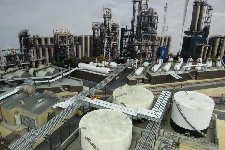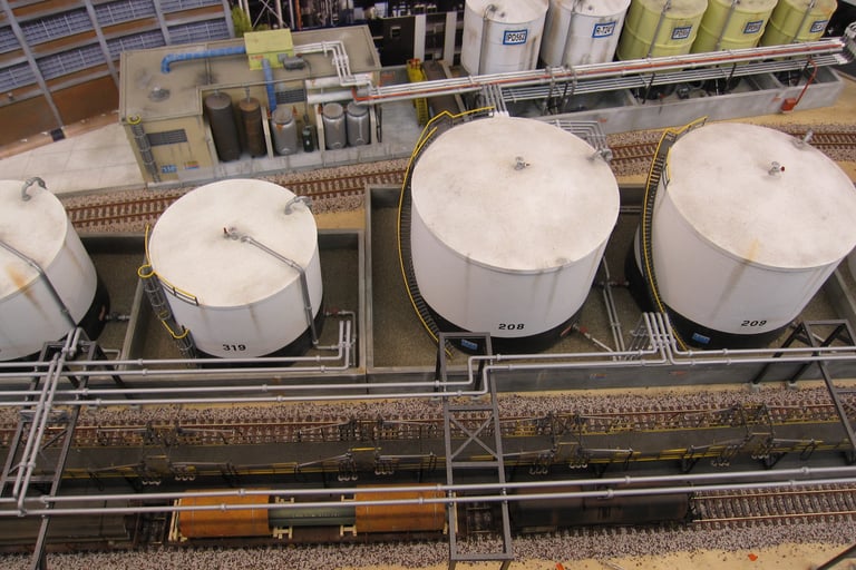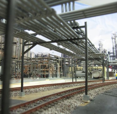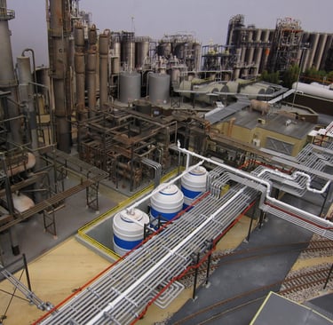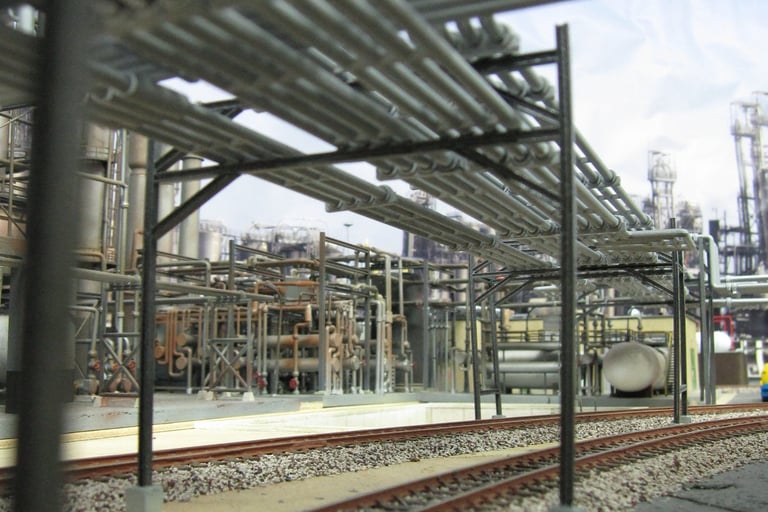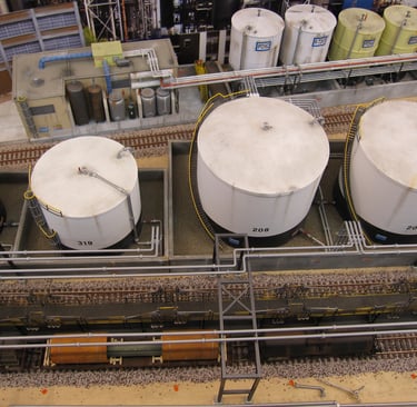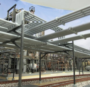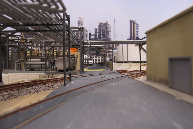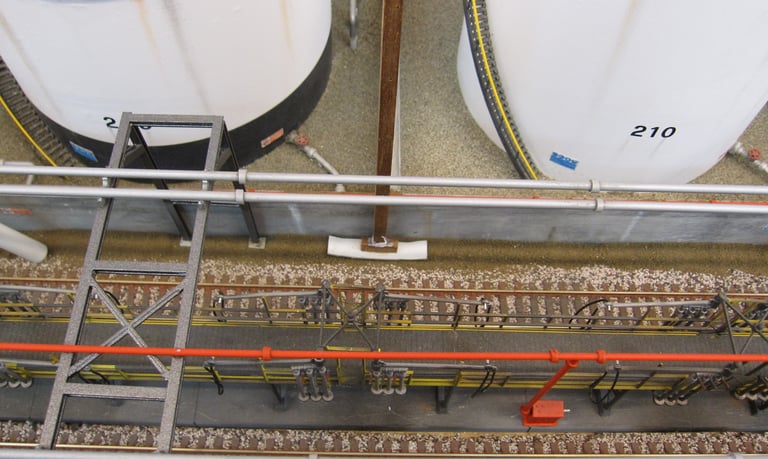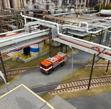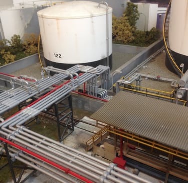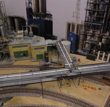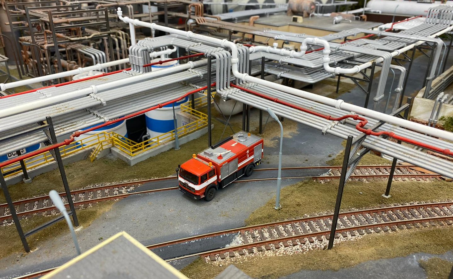 Per riprodurre una così grande quantità di tubazioni anche nella raffineria GM Oil in scala HO, iniziai già durante la fase di progettazione del plastico: dovevo unire in modo plausibile tre impianti di pirolisi, più di quaranta serbatoi, le pensiline di carico e di scarico per il trasferimento del petrolio e dei prodotti raffinati, nonché aggiungere l’intera rete antincendio e pure i tubi del gas diretti ai relativi serbatoi cilindrici. C’era davvero di che preoccuparsi… Senza farmi prendere dal panico, decisi di risolvere un problema alla volta.