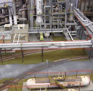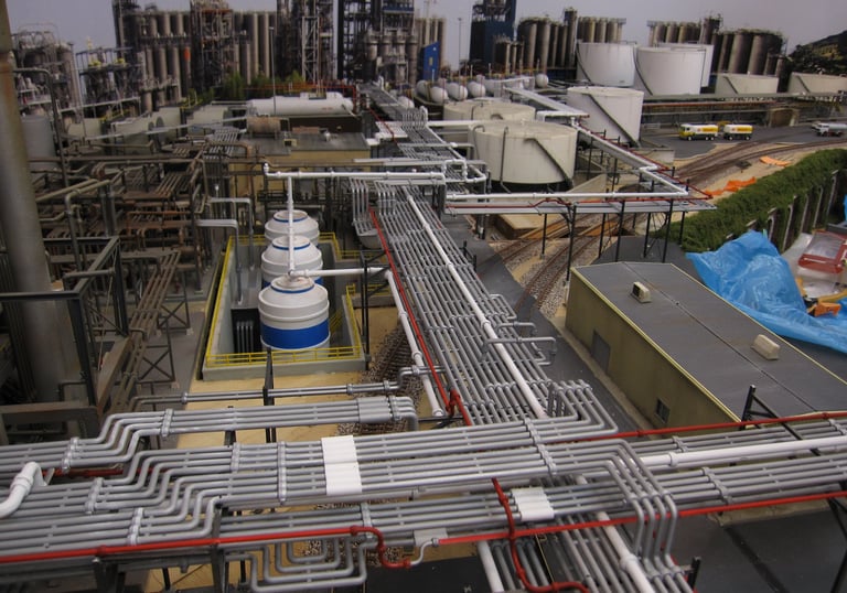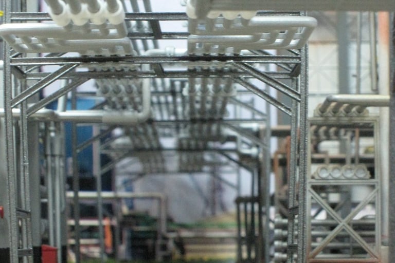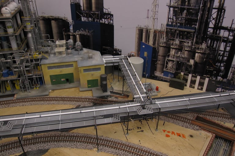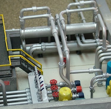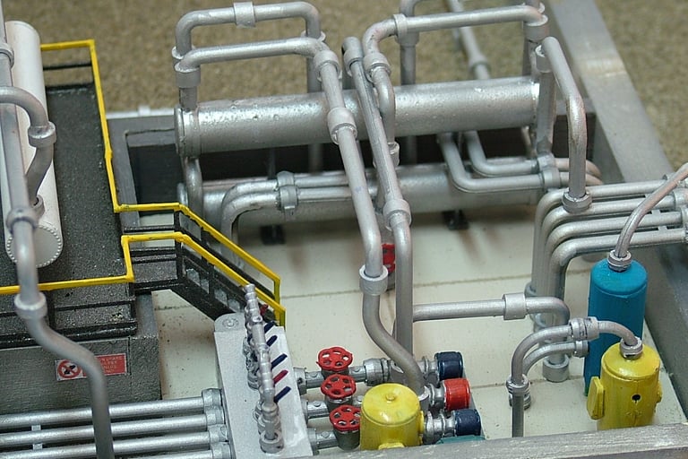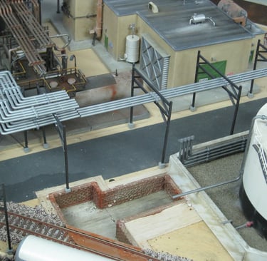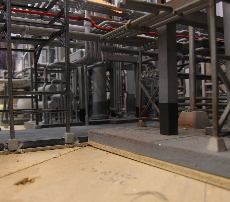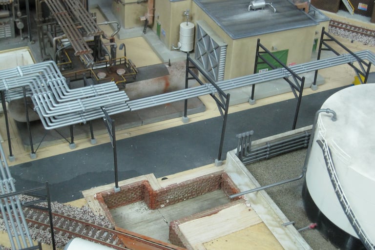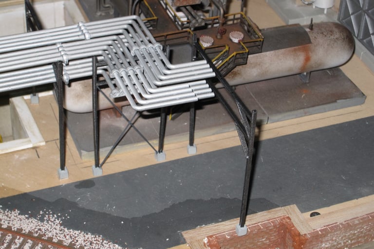 La distanza tra un portale ed il successivo era prestabilita dal gruppo di quattro flange di collegamento, quindi il lavoro risultò preciso e non difficile. Ciascuna sezione veniva sempre poggiata provvisoriamente sul plastico ancora in costruzione, per capire con precisione dove predisporre gli sbocchi di collegamento per gl’impianti di piroscissione, per i serbatoi, per le piattaforme. Nei casi più incerti, onde non sprecare lavoro e materiali, alcuni gruppi di condotte già pronti vennero stivati in grandi scatole, pronti all’uso mentre proseguivano le costruzioni delle strutture a cui sarebbero stati collegati. Nel frattempo costruii una diversa serie di tubazioni, con maggior diametro e di colorazione differente, destinata - nella realtà - a trasferire all’interno dello stabilimento altri fluidi.
