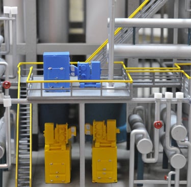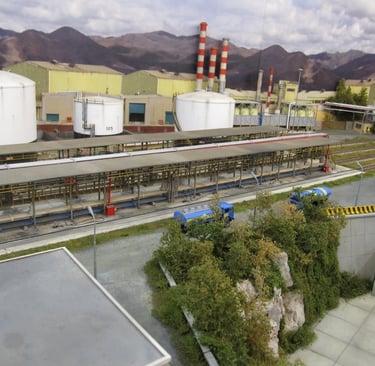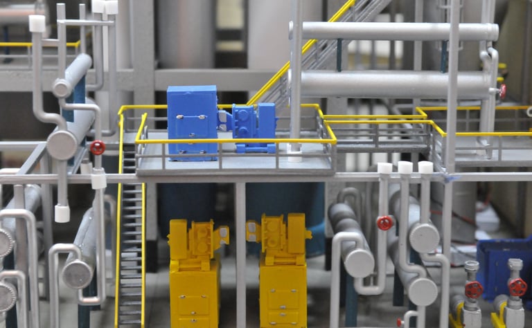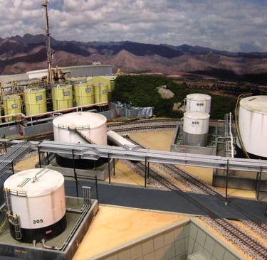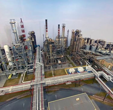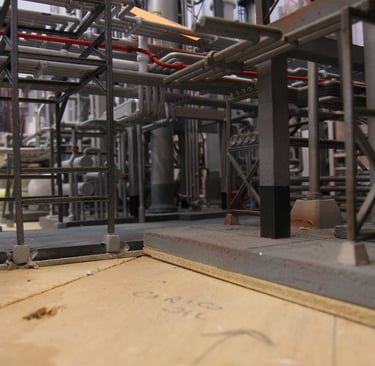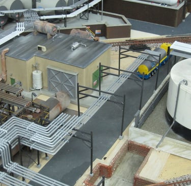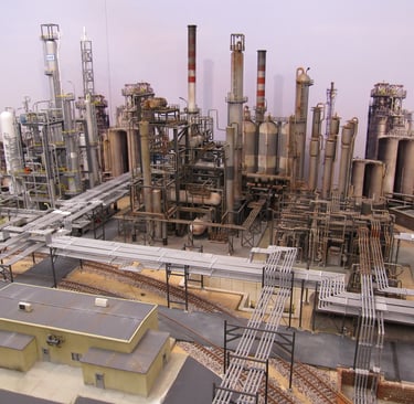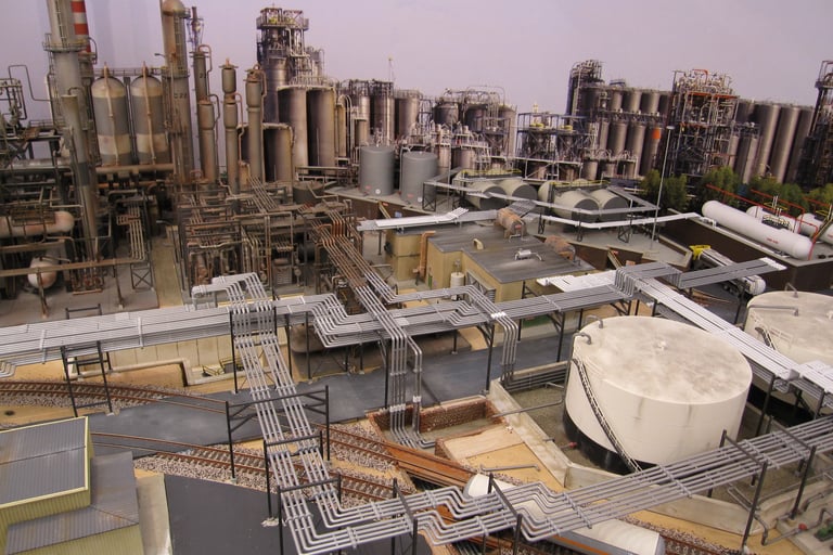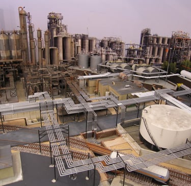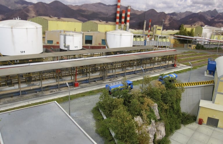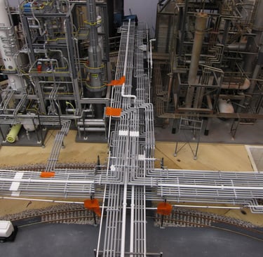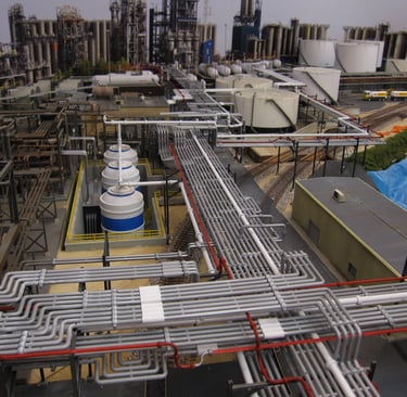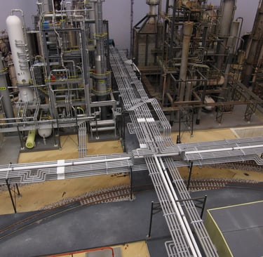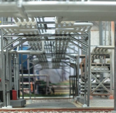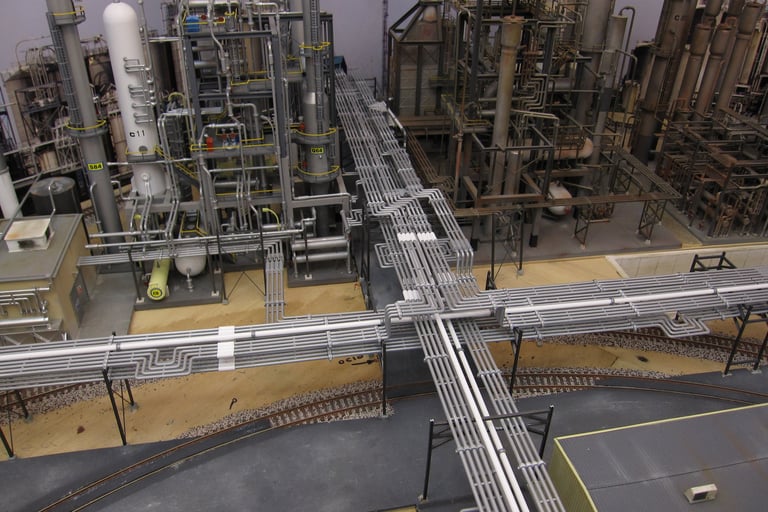 La distanza tra un portale ed il successivo era prestabilita dal gruppo di quattro flange di collegamento, quindi il lavoro risultò preciso e non difficile. Ciascuna sezione veniva sempre poggiata provvisoriamente sul plastico ancora in costruzione, per capire con precisione dove predisporre gli sbocchi di collegamento per gl’impianti di piroscissione, per i serbatoi, per le piattaforme. Nei casi più incerti, onde non sprecare lavoro e materiali, alcuni gruppi di condotte già pronti vennero stivati in grandi scatole, pronti all’uso mentre proseguivano le costruzioni delle strutture a cui sarebbero stati collegati. Nel frattempo costruii una diversa serie di tubazioni, con maggior diametro e di colorazione differente, destinata - nella realtà - a trasferire all’interno dello stabilimento altri fluidi.