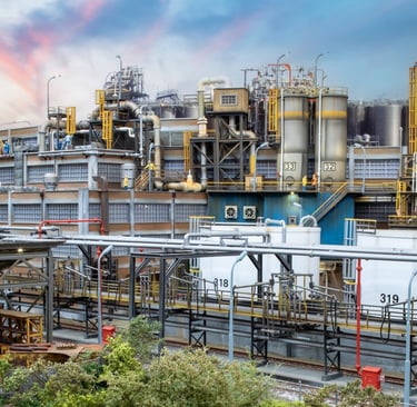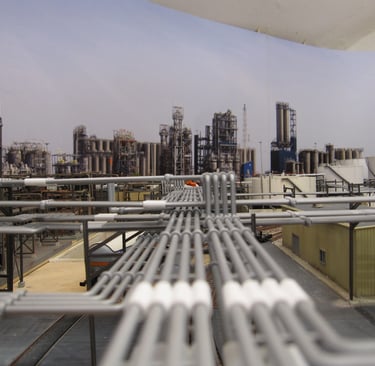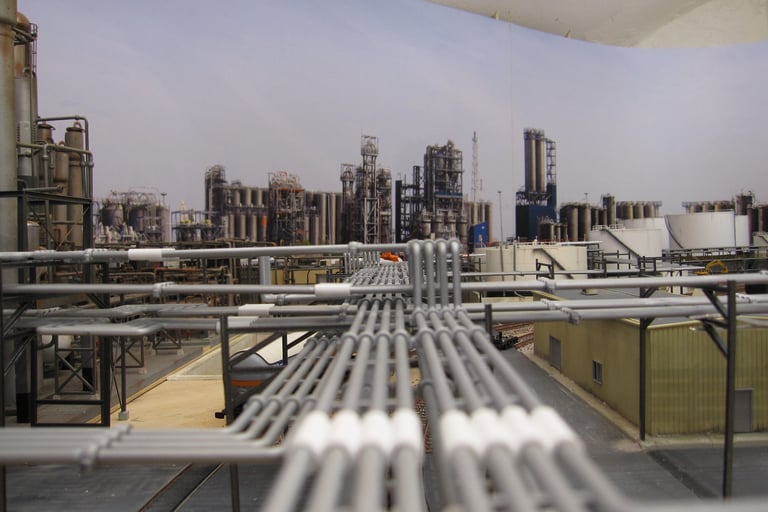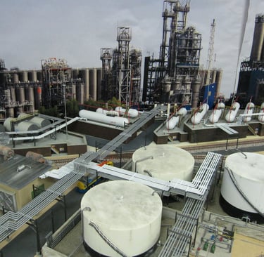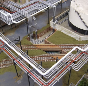 Un vero stabilimento petrolchimico è percorso in ogni direzione dai fasci delle tubazioni sopraelevate ed interrate che collegano gli impianti di lavorazione del petrolio grezzo. La complessa rete di condutture consente il trasporto, l’accumulo ed il trasferimento delle sostanze fluide o gassose tra i serbatoi di stoccaggio intermedio, i gruppi della piroscissione e i vasi di riserva utilizzati per il rifornimento delle pensiline di carico con i prodotti finiti.