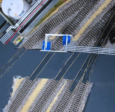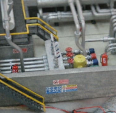 L’attività di prevenzione incendi è altresì testimoniata dalla grande quantità di scritte ed avvisi monitori presenti in tutto il plastico: le scritte “ Vietato Fumare” o “ Vietato l’uso di fiamme libere”, con lettere bianche su fondo rosso, sono state incollate con colla vinilica e trattenute sulla punta di uno stuzzicadenti fino a trovare il corretto punto di fissaggio, di solito ad altezza d’uomo “Preiser”, lungo le basi dei grandi serbatoi, delle torri di raffinazione oppure lungo la rete di cinta e nelle zone più pericolose, come i depositi dei fusti di carburante, delle bombole di gas propano e sulle piattaforme di carico e scarico. Dopo circa sei mesi, terminato il lavoro sulle tubazioni quasi contemporaneamente alle strutture sul plastico, mi incuriosii a calcolarne lo sviluppo complessivo. Qui lo riporto (sottovoce), quasi incredulo: quattrocentocinquanta metri lineari.