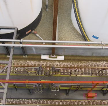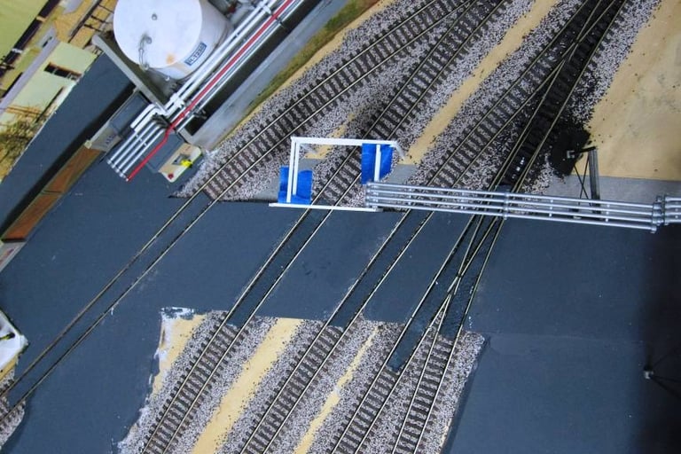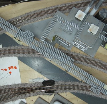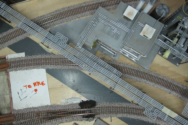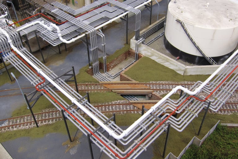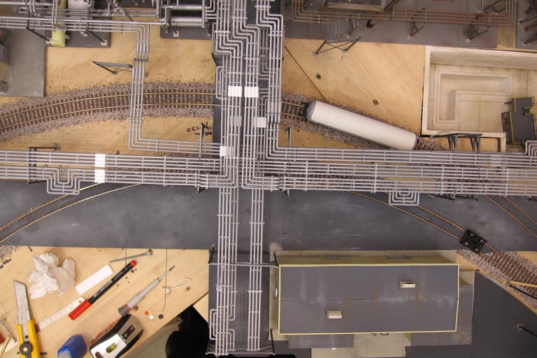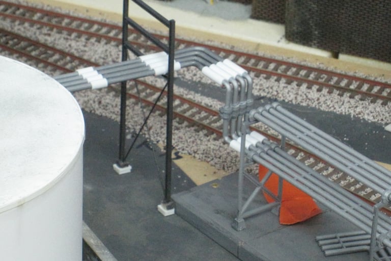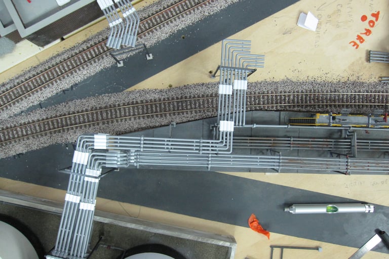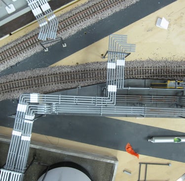 Perciò era giunto il momento di collegarli con la rete delle condutture. Nei mesi successivi, ogni sezione del piping completata a tavolino fu attentamente incollata sul telaio nei punti prestabiliti con colla vinilica e pressata in posizione con pesi sistemati sopra ai tubi fino alla completa asciugatura, di solito non meno di quarantott’ore. Il corretto allineamento degli spezzoni rettilinei fu garantito dall’utilizzo di una livella laser molto utile allo scopo. I collegamenti con gli impianti, i serbatoi e le pensiline vennero risolti con l’uso delle flange, se i tratti da unire erano perfettamente affacciati. In caso contrario, dopo aver cercato di minimizzare l’errore dividendolo tra il tratto afferente e quello ricevente, utilizzai i manicotti scorrevoli (semplici sezioni di tubo vuoto con maggior diametro di quelli da unire), interponendoli tra i gruppi da incollare: la solita goccia di colla avrebbe poi bloccato il tutto in posizione. Fin qui, tutto bene. Però la prevista rete di tubazioni non comprendeva soltanto tratti dritti e così, terminata la stesura dei blocchi principali, mi preoccupai di realizzare tutte le sezioni minori e quelle più tortuose, comprese le tubazioni semi-interrate nei cunicoli, i sottopassi delle linee ferroviarie e della rete stradale ed anche alcuni collegamenti con le vasche di decantazione sotterranee.