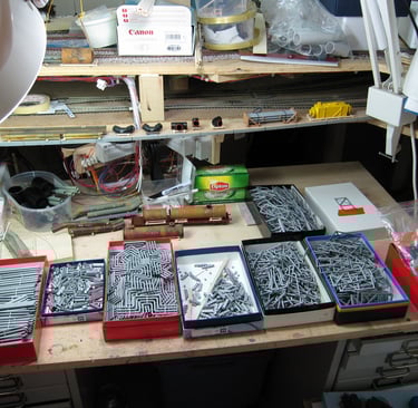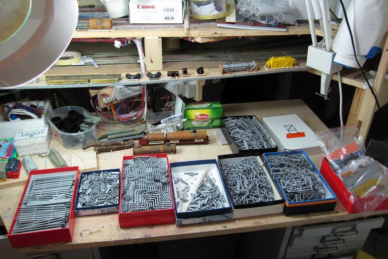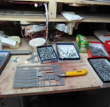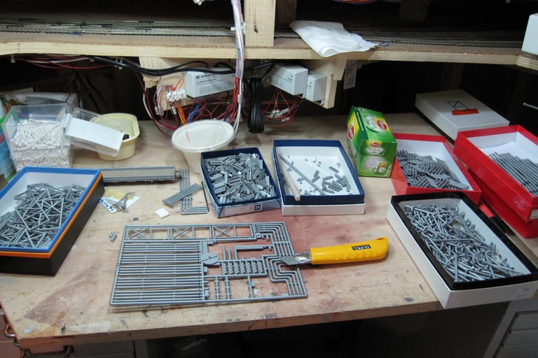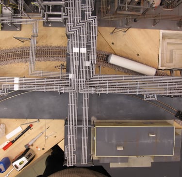 Recuperate altre scatole, stivai tutti portali a seconda della loro dimensione, pronti all’uso per il montaggio sul plastico. Quindi, feci un controllo generale: portali pronti; tubazioni rettilinee dipinte; flange dipinte; curve dipinte; quantità di colla sufficiente. Potevo iniziare a metter mano al… lavoraccio del tubo! La prima cosa fu quella di organizzare il montaggio su una superficie piatta e comoda: il mio solito banco da lavoro era perfetto, luce abbondante, attrezzi a portata di mano e… tranquillità notturna. Mi concentrai dapprima sulla realizzazione dei fasci più complessi e lunghi, come i tratti rettilinei accanto alle strade in corrispondenza degli impianti: in quei punti avrei dovuto realizzare degli attraversamenti complicati, spesso con incroci stratificati fino a sei livelli. Un lavoro che avrebbe richiesto molta pazienza. I segmenti delle tubazioni provenienti dalle scatole di montaggio erano lunghi 100 millimetri: alle loro estremità era necessario incollare (solito cianoacrilato Loctite 401) il gruppo di quattro flange per l’incastro con il segmento successivo. Lentamente i tratti rettilinei delle condutture - al massimo 600 millimetri per volta - prendevano forma: ogni segmento ottenuto veniva montato sulla propria serie di portali, già pronti nelle scatole della riserva.