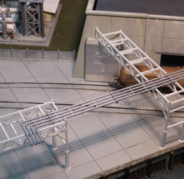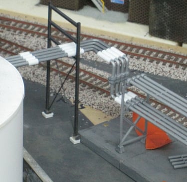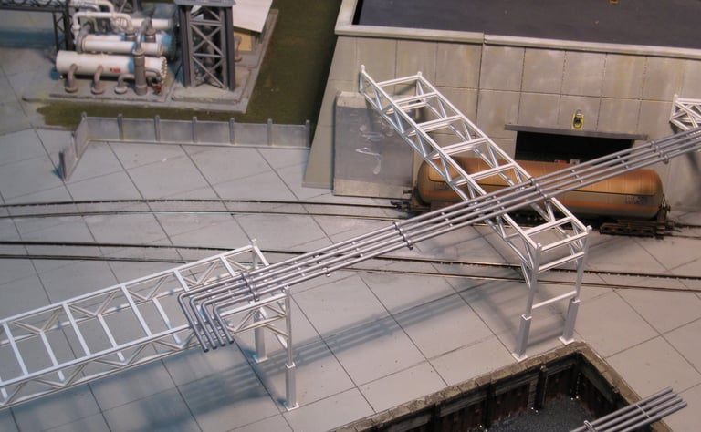 Considerando che lo sviluppo preponderante delle condutture vere risulta sospeso sopra al piano stradale, progettai di far combaciare i tratti dritti delle strade interne alla raffineria con altrettante tubazioni rettilinee e sopraelevate, magari su più livelli, sorrette da portali. In secondo luogo, mi serviva un’unità di misura dei tubi con relativi ingombri. Dopo alcune ricerche, scelsi un prodotto della Ditta Walthers che sembrò adatto alle mie esigenze: una scatola di montaggio (art. 3114) contenente le condotte rettilinee raggruppate in sezioni di quattro tubi paralleli, ciascuna lunga 100 millimetri. In più, erano presenti le indispensabili curve, i gomiti, le flange d’unione, i supporti e gli innesti a “T”. Ora avevo le idee più chiare e potevo iniziare sia la costruzione dei portali destinati a sorreggere le condutture sia l’effettuazione d’un primo ordine del prodotto alla Casa Statunitense.