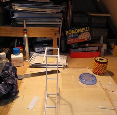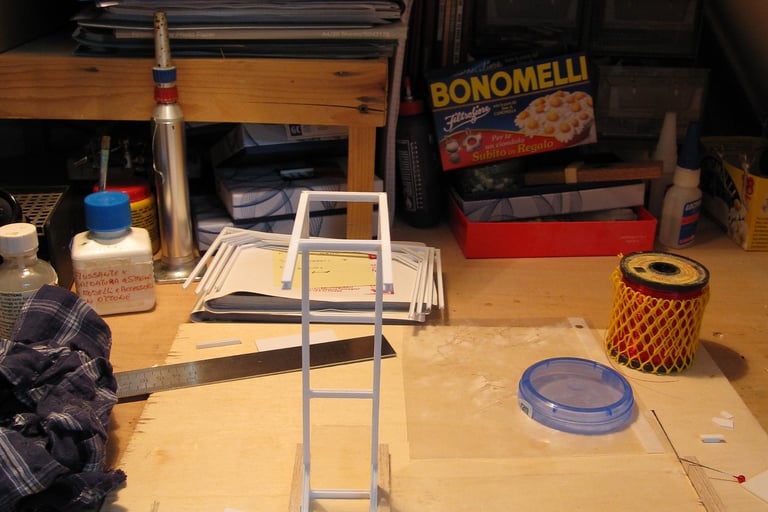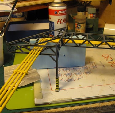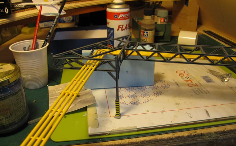 Costruii un’altra dima in legno per montare con l’aiuto della colla cianoacrilica i portali in maggiore rapidità e senza dover controllare ogni volta gli angoli retti tra i profili in Abs. Per dare maggiore robustezza all’intero impalcato ed evitarne flessioni, aggiunsi un irrigidimento incrociato usando filo d’acciaio da 0,8 mm di diametro, incollato tra la base del plinto e il primo supporto orizzontale. Sui portali di dimensioni più grandi - quelli per gli attraversamenti dei binari oppure per le intersezioni stradali - non potevo usare il filo d’acciaio (avrebbe impedito il transito ai veicoli sottostanti): perciò rinforzai le travi di sostegno orizzontali aggiungendo negli angoli formati tra la trave verticale e quella orizzontale altri segmenti a 45 gradi della medesima plastica Abs.