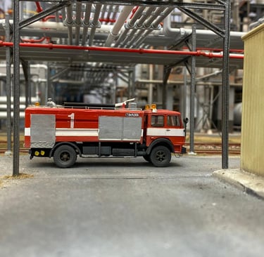 Mica finito: assieme alla rete delle condutture per idrocarburi e derivati, ho costruito anche i fasci delle tubazioni antincendio che spiccano nettamente tra le consorelle a causa della loro vivace livrea rossa. Immaginando che la condotta principale provenga dalla centrale antincendio - posta al di fuori della porzione di industria riprodotta - le condutture si sviluppano per l’intero stabilimento petrolchimico, unite tra loro da flange, curve, derivazioni ed innesti come già avvenuto per gli altri tipi. Il tubo che ho utilizzato per questo scopo ha il diametro di 2 millimetri, più sottile quindi degli altri presenti sul plastico (Evergreen ……..) e la sua verniciatura è stata effettuata con colore rosso spray nitro opaco (Ral 5012). Anche per le condotte antincendio si è proceduto ad una preparazione fuori opera, prima di essere incollate con cianoacrilato sui portali nello spazio ad esse riservato: la loro minor sezione ha permesso la posa di tratti più lunghi e conseguente minor utilizzo di flange, come al solito ricavate da un tubo di diametro un poco più largo.