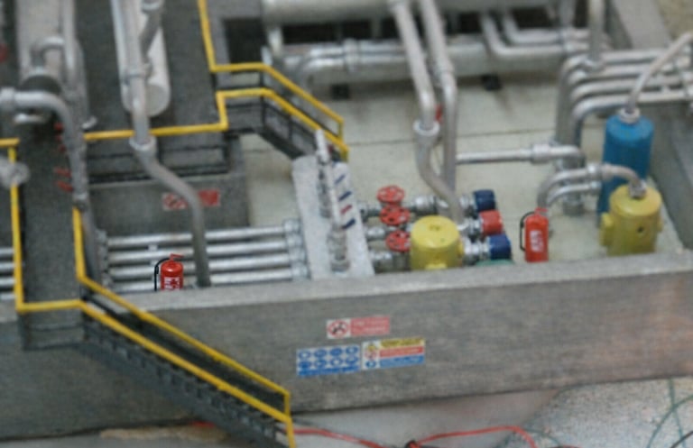Un rettangolino di polistirene incollato sulla parete frontale imita il portello d’accesso, a sua volta munito di contrassegno alfabetico mentre due goccioline di colore argento deposte con la punta d’un ago imitano le cerniere d’apertura. Tutti gli armadietti antincendio - più di una ventina - sono contraddistinti dalla stessa livrea rossa usata per le relative tubazioni e sono presenti un po’ dovunque: in ogni impianto di cracking, nella zona degli scambiatori di calore, nelle postazioni di scarico del petrolio greggio ed accanto ai locali tecnici del porto. Nel plastico della raffineria ho previsto alcune zone munite di botole estraibili per effettuare le manutenzioni del caso. Come le consorelle dei prodotti petroliferi, anche le condotte dell’impianto antincendio sono interrotte nei punti di giunzione tra le parti fisse e quelle estraibili: il solito manicotto mobile - di sezione più larga - inserito in uno dei due monconi s’incarica di coprire lo spazio vuoto tra i tubi, solo affiancati senza nessuna unione tra loro. Prima di sollevare la parte mobile, è sufficiente quindi far scorrere il manicotto lungo l’uno o l’altro tubo per liberare la botola, anche se, a vista, le tubazioni non mostrano alcuna interruzione.