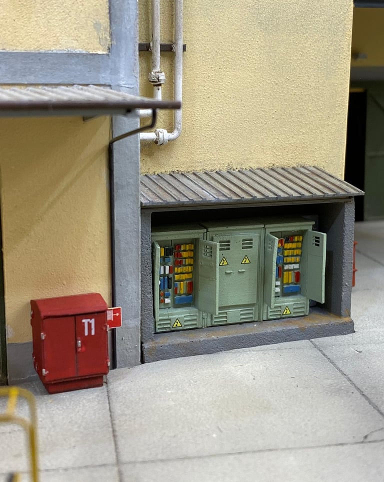 Dopo l’ancoraggio sul terreno delle condutture già fissate sui portali, fu sufficiente collegare i monconi tra loro con brevi tratti di tubazioni. Piuttosto complicato si è rivelato invece tale lavoro a proposito del secondo impianto di cracking e in alcune aree dei serbatoi di stoccaggio: nonostante i controlli e le misurazioni effettuate più volte, le condotte ivi dirette sono risultate fuori asse di un paio di centimetri, costringendomi ad aggiungere alcune curve a gomito per riuscire a collegarle. Anche all’interno del terzo impianto di piroscissione il percorso della tubatura antincendio è molto intricato essendo l’impianto più grande e complesso: dalla condotta principale si staccano le diramazioni dirette verso le vicine torri catalitiche e verso il surriscaldatore secondario. Oltre alla rete delle tubazioni antincendio, ho realizzato anche molti altri dettagli ad esse pertinenti, come gli armadietti per le manichette srotolabili. Nella realtà, gli armadietti contengono sia le manichette che altri oggetti di uso immediato: nella mia riproduzione sono stati realizzati costruendo un master e clonandolo successivamente con gomma siliconica e resina bicomponente. Il master è stato costruito tagliando sezioni da 1,5 centimetri da un profilato in polistirene di forma rettangolare vuoto all’interno. Da striscioline dello stesso materiale (mm 4,8 x 0,5, Evergreen ….) ho ricavato il tetto nonché un’aletta di forma quadrata, fissata alla parete sinistra di ogni manufatto in modo da sporgere dalla sagoma a mo’ di bandiera. Sull’aletta è stato poi incollato il relativo cartello, disegnato all’elaboratore con apposito programma e stampato ad alta risoluzione su supporto cartaceo, riducendolo ad un quadratino di 2 millimetri per lato.